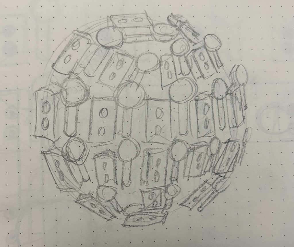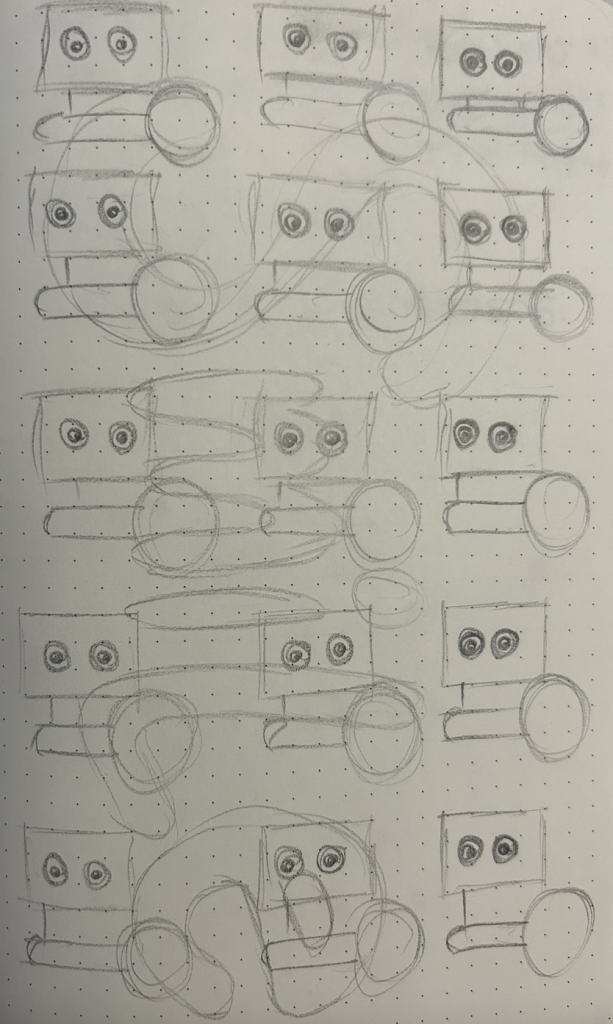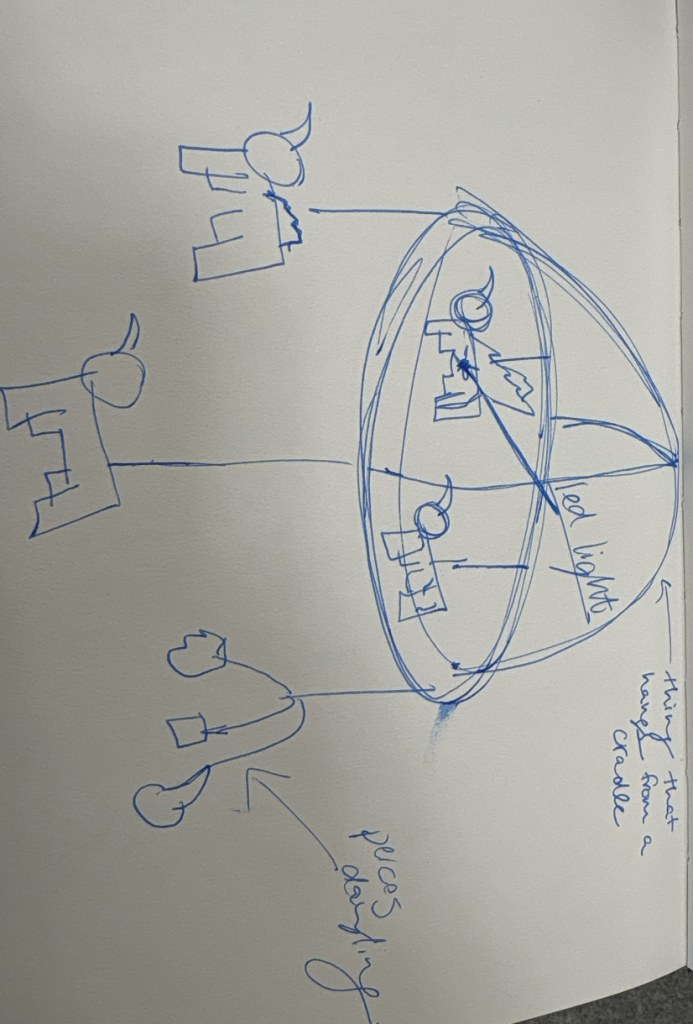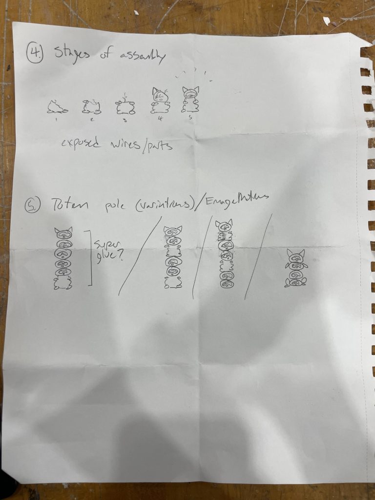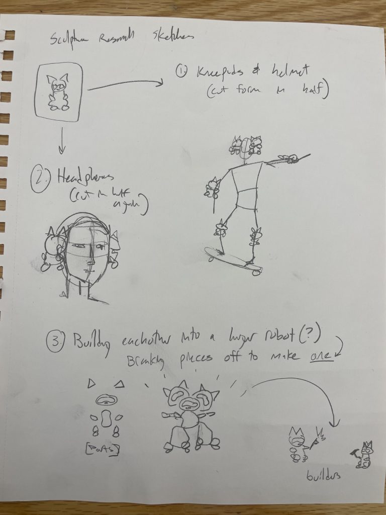 In a literal sense, my molded object is a robotic cat toy from the 2000’s. It is about 10 inches tall, 6 inches wide, and mostly silver and dark blue. It serves as a “throwback” a nod to 2000’s nostalgia and developing technology for a more playful purpose. It brings me back to my childhood, simpler times when this robotic cat (amongst other toys) was the primary source of fun and play. Conceptually, I’d like to relate these themes to the overall sculpture by creating something playful and fun. On the other hand, I could also use it as a contrasting element and create something serious, capitalistic/consumeristic, and non-playful. These robotic cats could be harnessing their powers to build a larger robot for evil purposes. This concept could also be turned around again to be playful and silly, as if the cats are plotting world demise but in a pitifully cute way. I attempted to communicate these ideas in my sketches below.