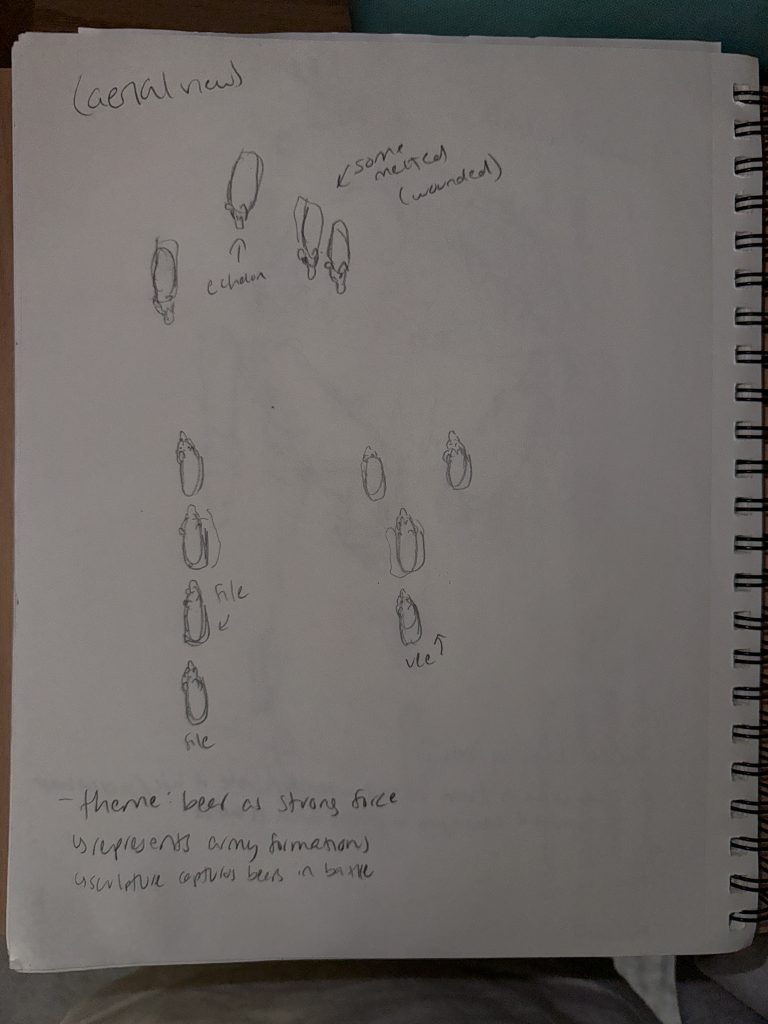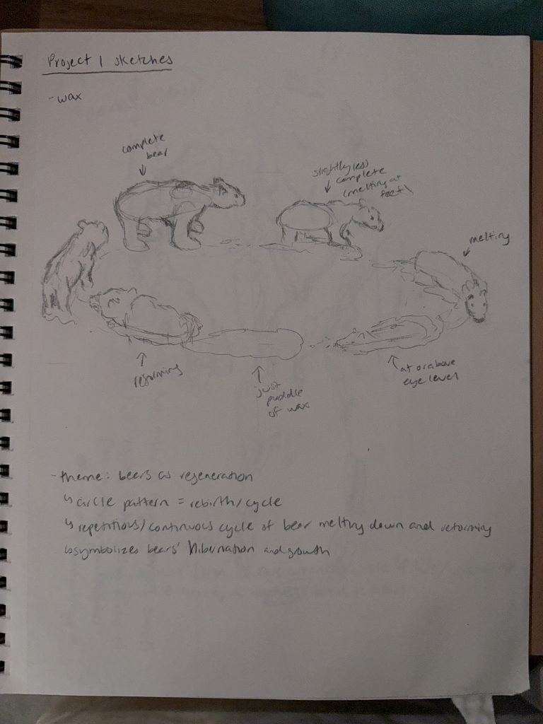 In this project, I want to explore the popularity of the bear motif, particularly highlighting its regenerative symbolism. As aforementioned, the bear imagery has been appropriated into the teddy bear, which has been continuously re-envisioned, created, and sold by toy companies for years. To add to this cyclical theme, the bear has been associated with regeneration and rebirth due to its tendency to hibernate in winter. Therefore, I want to emphasize the rebirth quality that bears carry. The ideas that I want to avoid are depicting the bear as possessing brutal strength or having violent dispositions. I feel that this is quite cliche and difficult to portray since the expression of the 3D-printed bear is neutral.