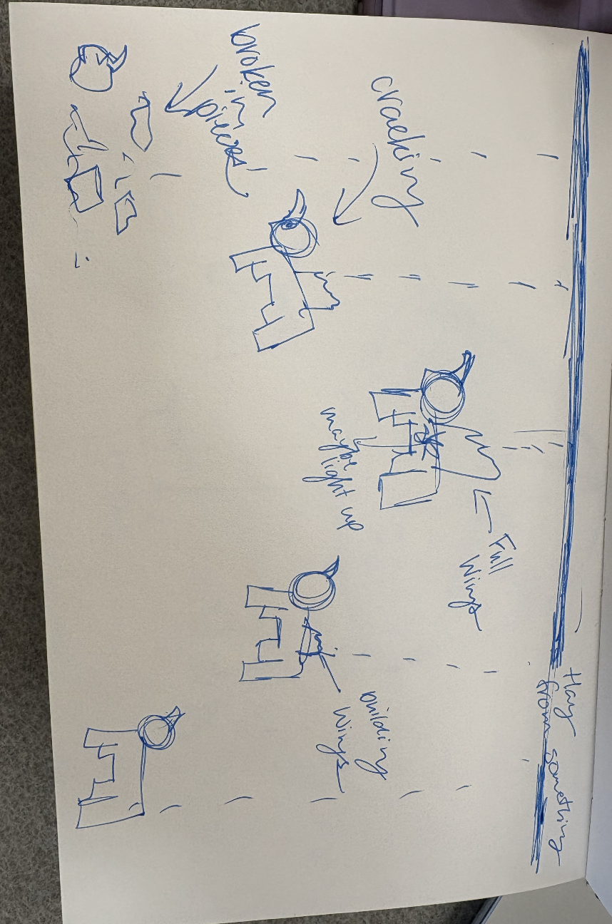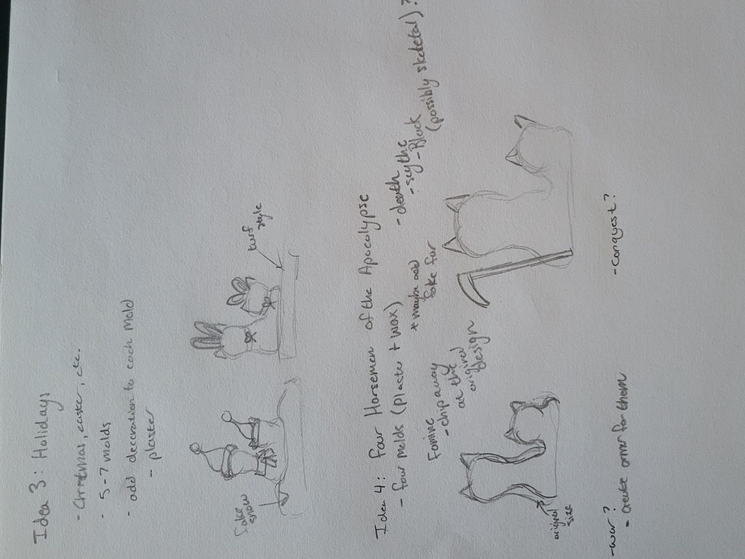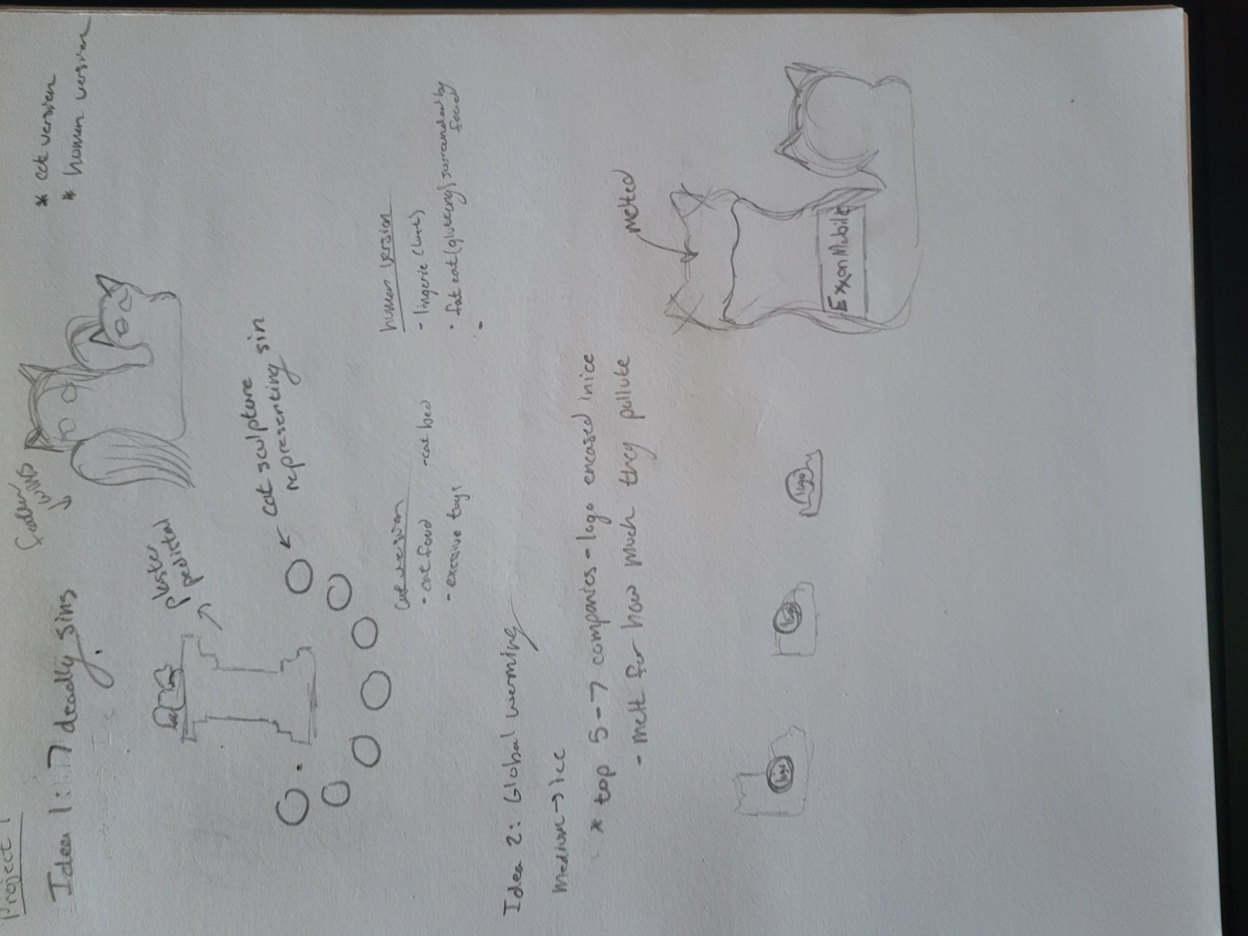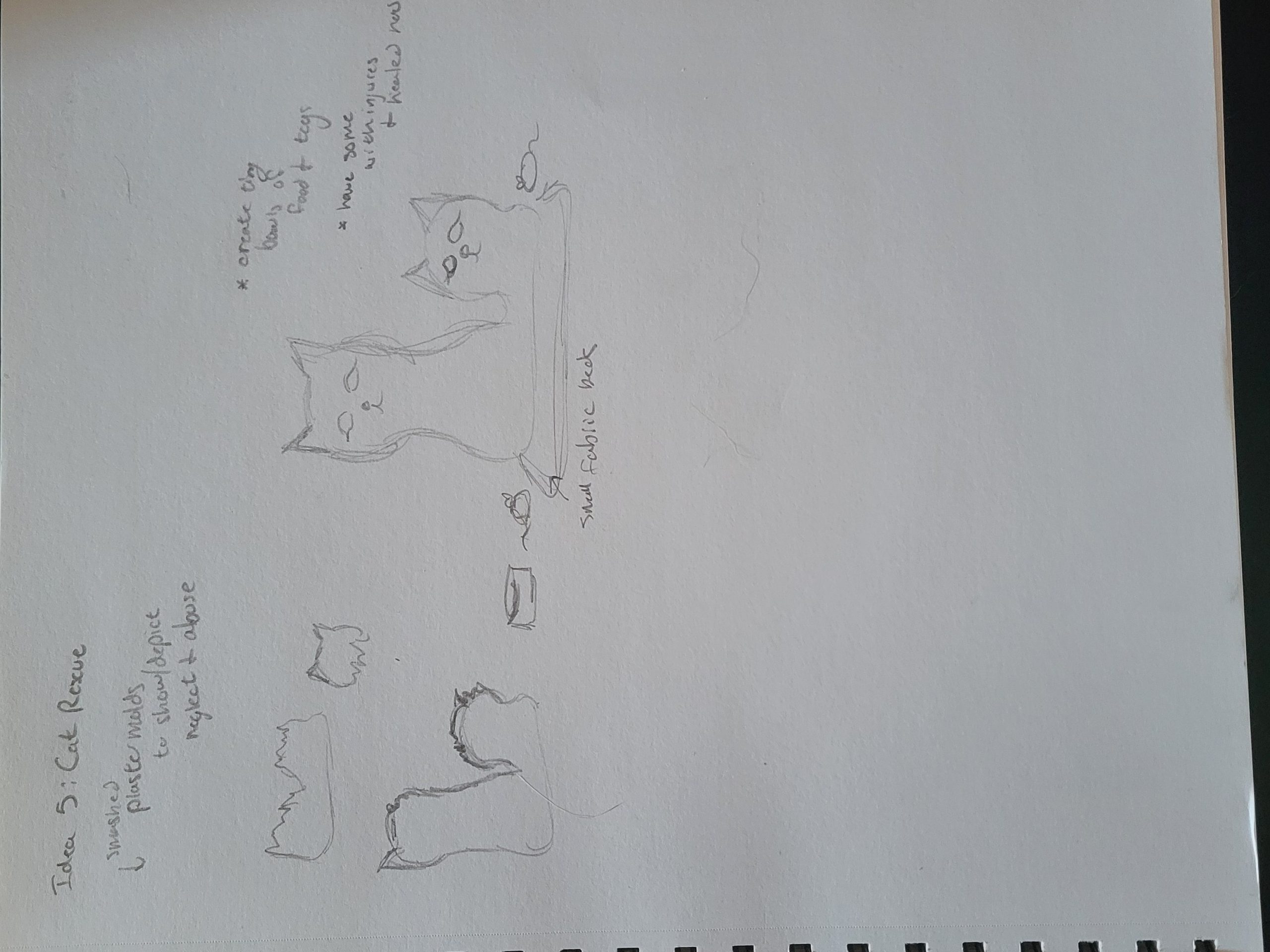In a literal sense, my molded object is a robotic cat toy from the 2000’s. It is about 10 inches tall, 6 inches wide, and mostly silver and dark blue. It serves as a “throwback” a nod to 2000’s nostalgia and developing technology for a more playful purpose. It brings me back to my childhood, simpler times when this robotic cat (amongst other toys) was the primary source of fun and play. Conceptually, I’d like to relate these themes to the overall sculpture by creating something playful and fun. On the other hand, I could also use it as a contrasting element and create something serious, capitalistic/consumeristic, and non-playful. These robotic cats could be harnessing their powers to build a larger robot for evil purposes. This concept could also be turned around again to be playful and silly, as if the cats are plotting world demise but in a pitifully cute way. I attempted to communicate these ideas in my sketches below.