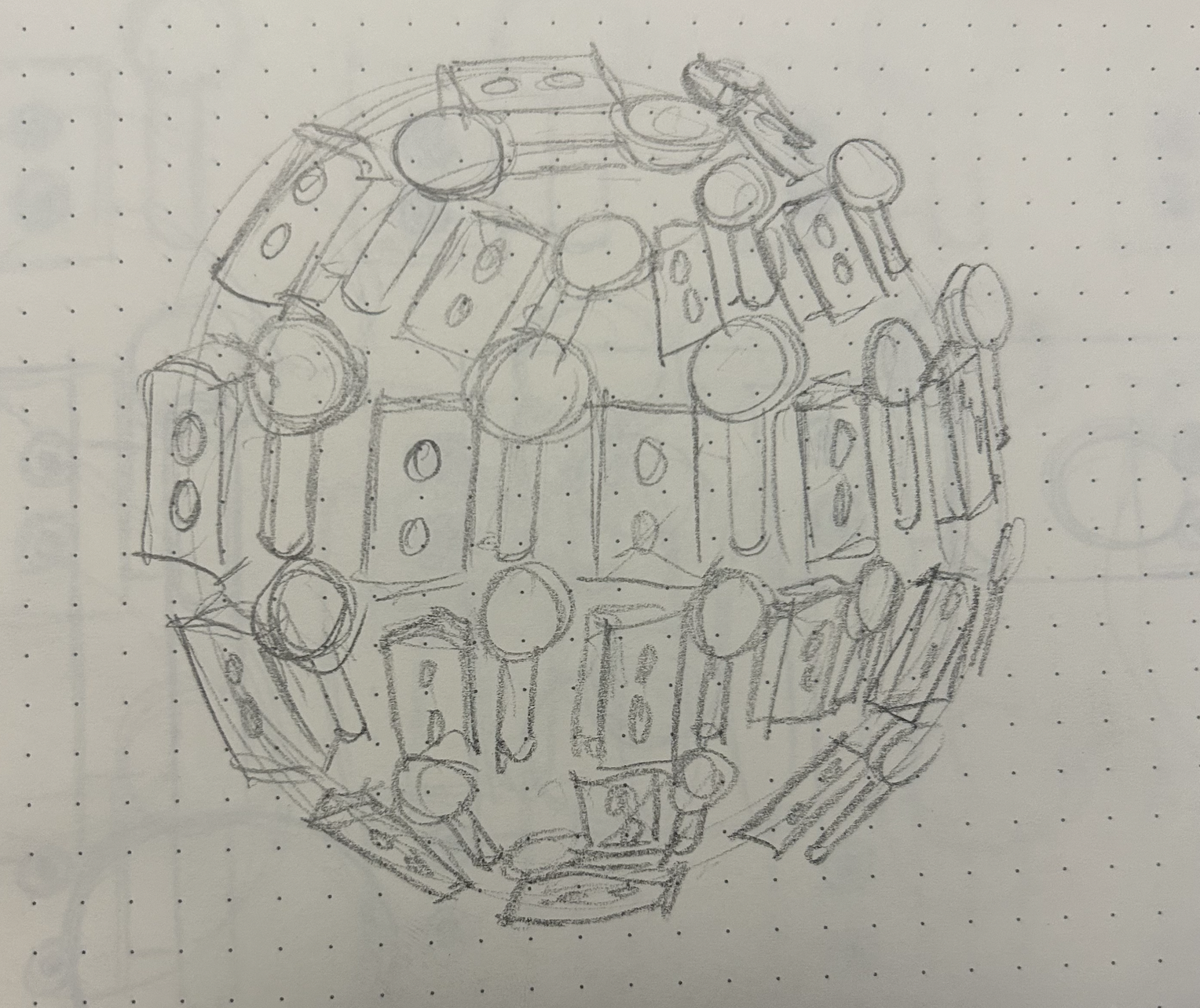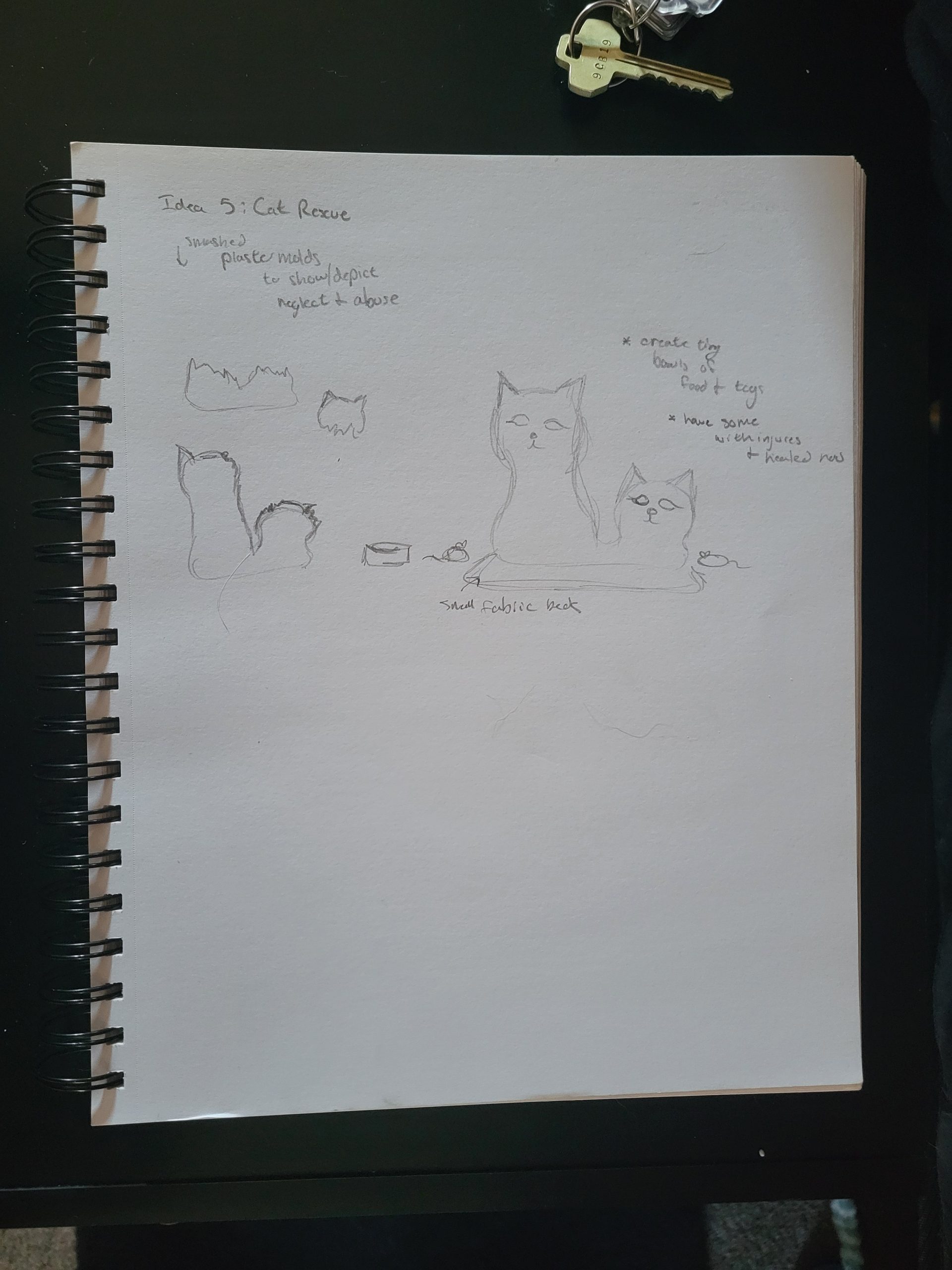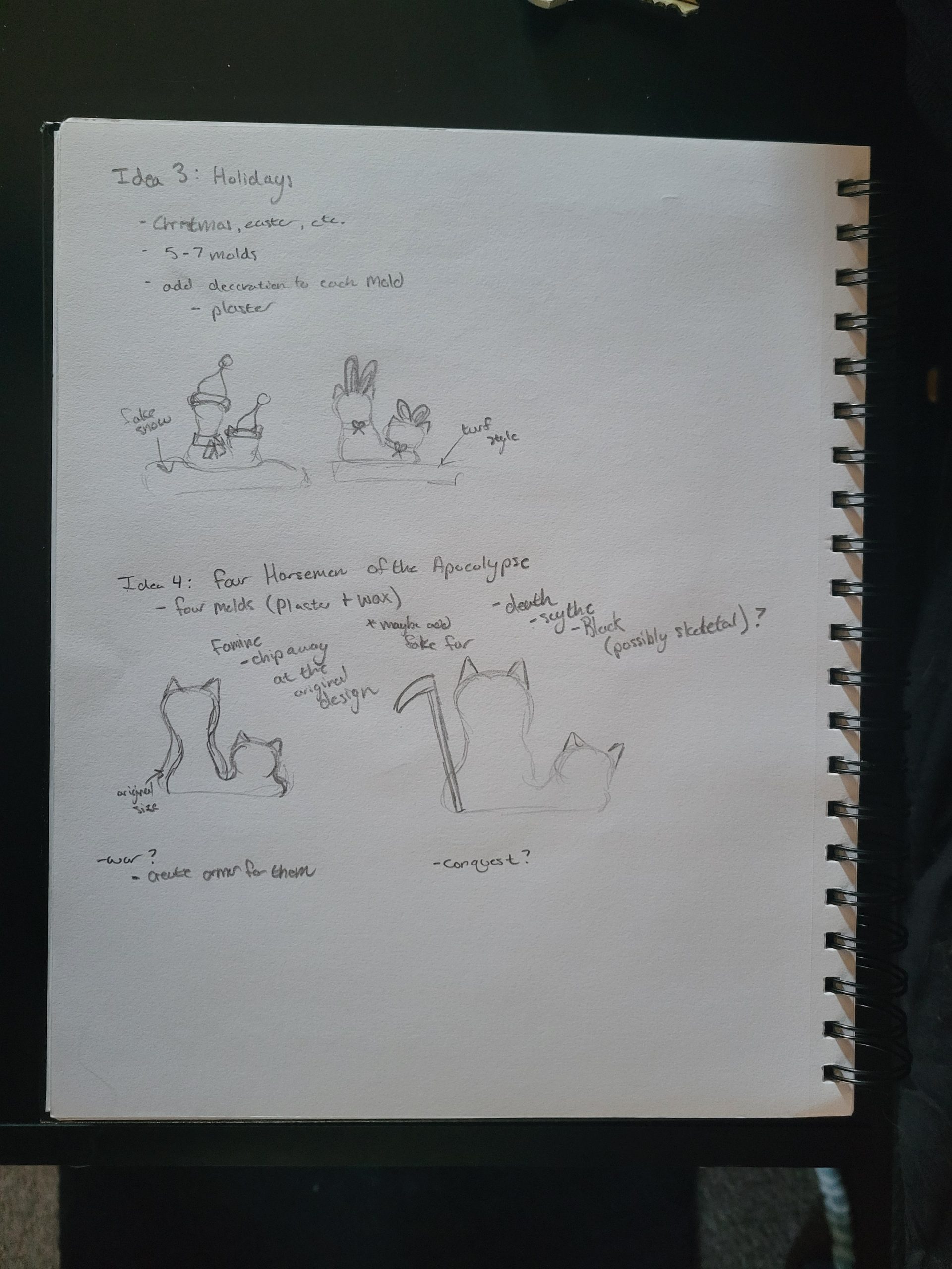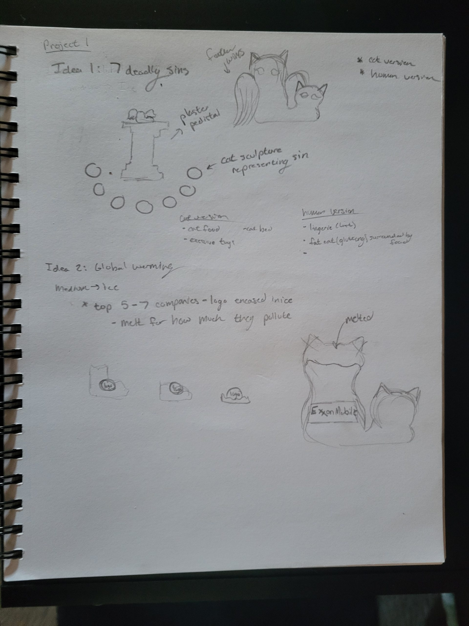 In a literal sense, my molded object is a robotic cat toy from the 2000’s. It is about 10 inches tall, 6 inches wide, and mostly silver and dark blue. It serves as a “throwback” a nod to 2000’s nostalgia and developing technology for a more playful purpose. It brings me back to my childhood, simpler times when this robotic cat (amongst other toys) was the primary source of fun and play. Conceptually, I’d like to relate these themes to the overall sculpture by creating something playful and fun. On the other hand, I could also use it as a contrasting element and create something serious, capitalistic/consumeristic, and non-playful. These robotic cats could be harnessing their powers to build a larger robot for evil purposes. This concept could also be turned around again to be playful and silly, as if the cats are plotting world demise but in a pitifully cute way. I attempted to communicate these ideas in my sketches below.